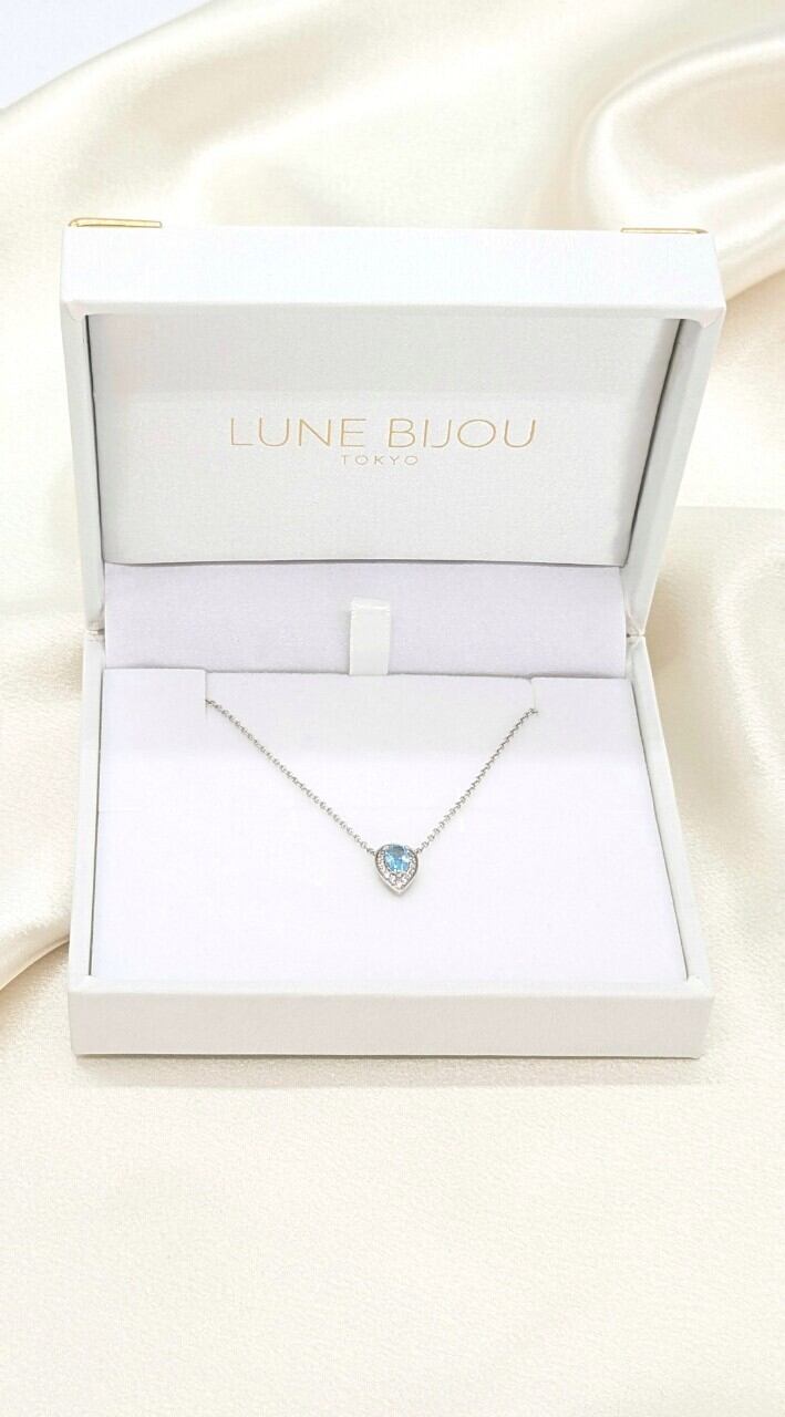 プレゼントなどの贈り物として最適なジュエリー専用ケース付き。白色の箱型にゴールドラインのアクセントが入ったラグジュアリー感溢れるケースとなっております。箱の内側に≪LUNE BIJOU TOKYO≫のロゴが印字されています。